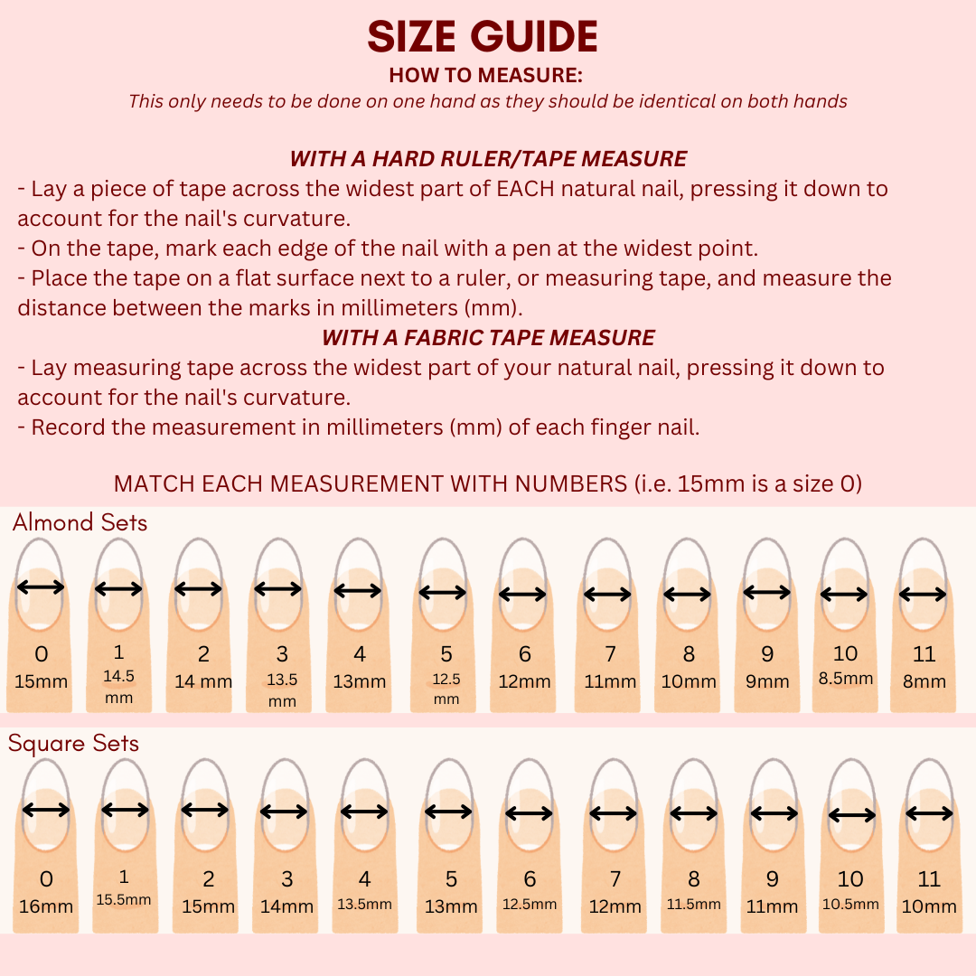 It is better to have them a bit bigger and file down than to have them smaller than the width of your nail. All designs account for the customer having to file them down on the sides to ensure accurate fit.